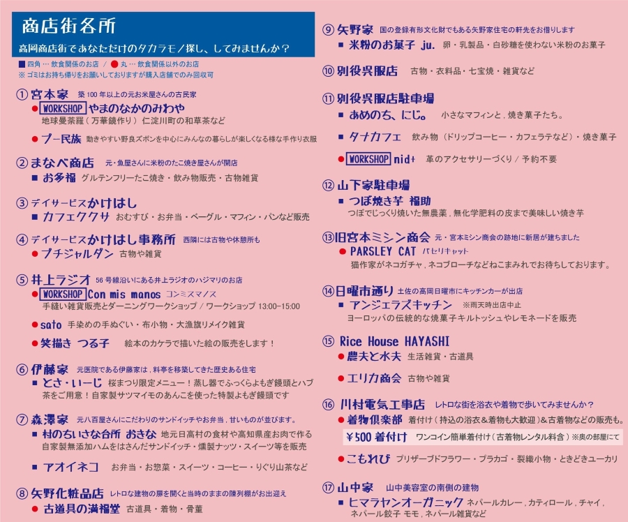 万華鏡作り、革のアクセサリー作り、小学生も参加できる縫い物などのワークショップが楽しめます。商店街各所に「楽しまんと楽団」が登場し、音楽演奏や踊りが披露されます。