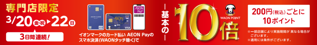3 月 20 日(金・祝)~ 22 日(日)の 3 日間は、専門店街でWAON POINTが 10 倍に。イオンマークのカード払いまたはAEON Payスマートフォン決済で、200 円ごとに 10 ポイント貯まります。WAONタッチは対象外です。