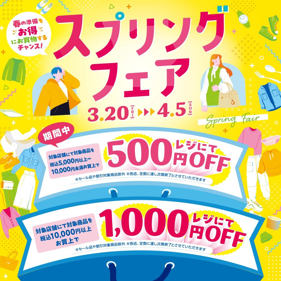 春物ファッションや新生活グッズなど、季節の変わり目はお買い物が増えるタイミング。専門店街でお得にお買い物できるキャンペーンも開催されます。