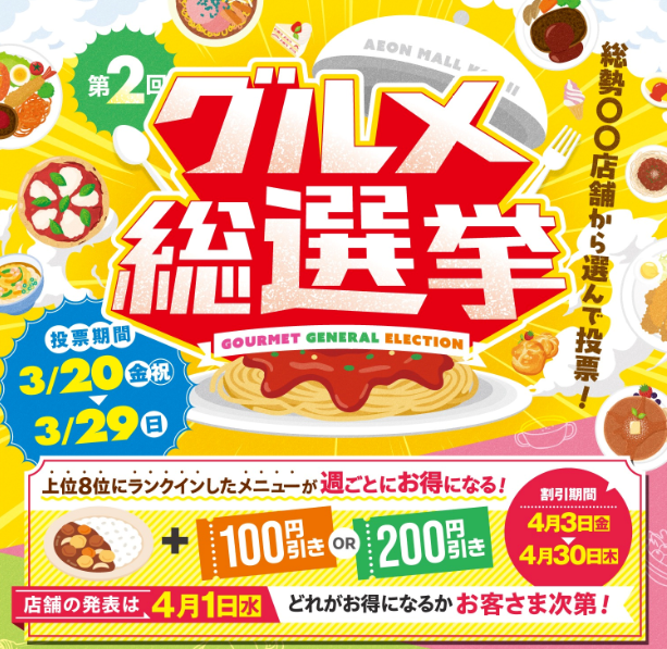 期間中は「グルメ総選挙」も開催。上位にランクインしたメニューが 4 月にお得に提供されるグルメイベントです。