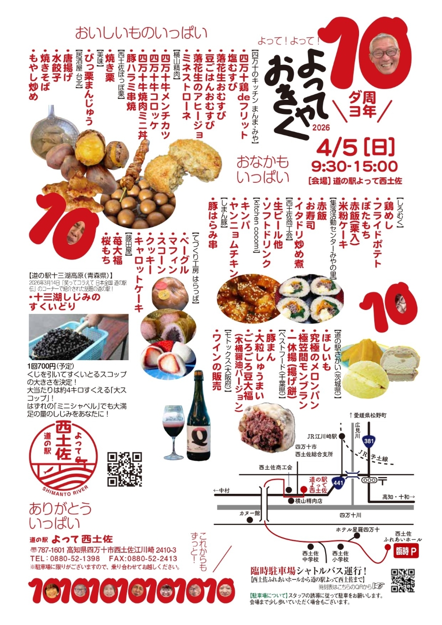 四万十市西土佐江川崎の道の駅「よって西土佐」で 2026 年 4 月 5 日(日)、開業 10 周年記念イベント「10 周年だよ!よっておきゃく!」が開かれます。