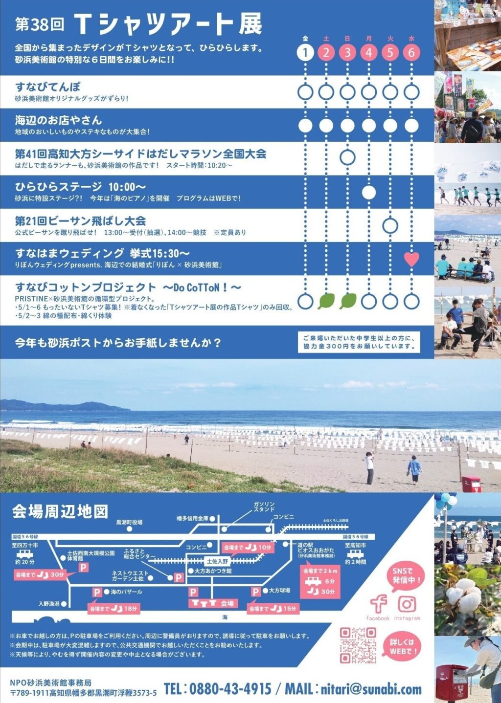 「第 38 回Tシャツアート展」が 2026 年 5 月 1 日(金)~ 6 日(水・振替休日)、黒潮町の「入野の浜」で開かれます。全国から集まったデザインのTシャツが美しい砂浜美術館で一斉にはためきます。