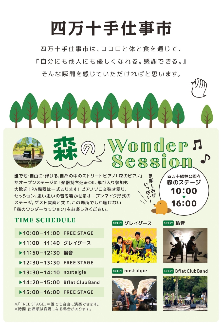 誰でも自由に楽しめる「森のピアノ」は、ゲストと一緒に演奏できるオープンステージ形式で行われます。利用時間は 10:00~16:00 です。