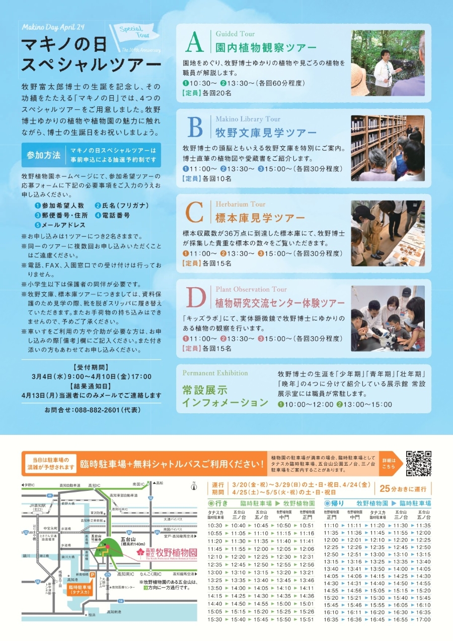 入園無料。「マキノの日スペシャルツアー」は参加費無料、事前の申し込みが必要です。公式サイトから申し込み。申込締切 4 月 10 日(金)17:00 まで。 |