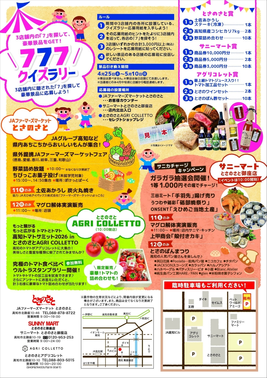 【2026年】高知市で4/11、12に「とさのさと7周年祭」|キャラクターパレードと撮影会、ちびっこお菓子投げ、野菜詰め放題…グルメも