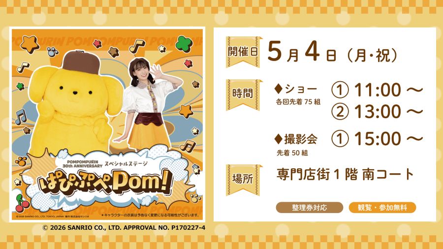 アニバーサリーイヤーを祝う「ポムポムプリンスペシャルステージ」が 5 月 4 日(月・祝)、専門店街 1 階・南コートで開かれます。