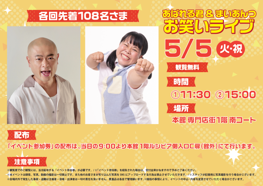 「あばれる君&まいあんつ お笑いライブ」が 5 月 5 日(火・祝)、専門店街 1 階・南コートで開かれます。お笑い芸人のあばれる君、まいあんつのステージが披露されます。