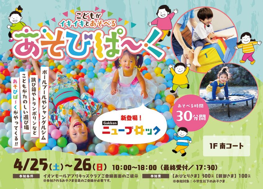 体を動かしたいお子さんにはうってつけ!「あそびぱ~く」が 4 月 25 日(土)、26 日(日)に専門店街 1 階・南コートで開かれます。