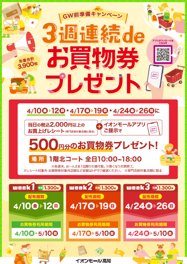 4 月 10 日(金)~12 日(日)、17 日(金)~19 日(日)、24 日(金)~26 日(日)に、当日 2000 円以上(税込み)の専門店街お買い上げレシートとイオンモールアプリを提示すると、各週末、お 1 人様 1 回限り 500 円分のお買い物券がプレゼントされます。
