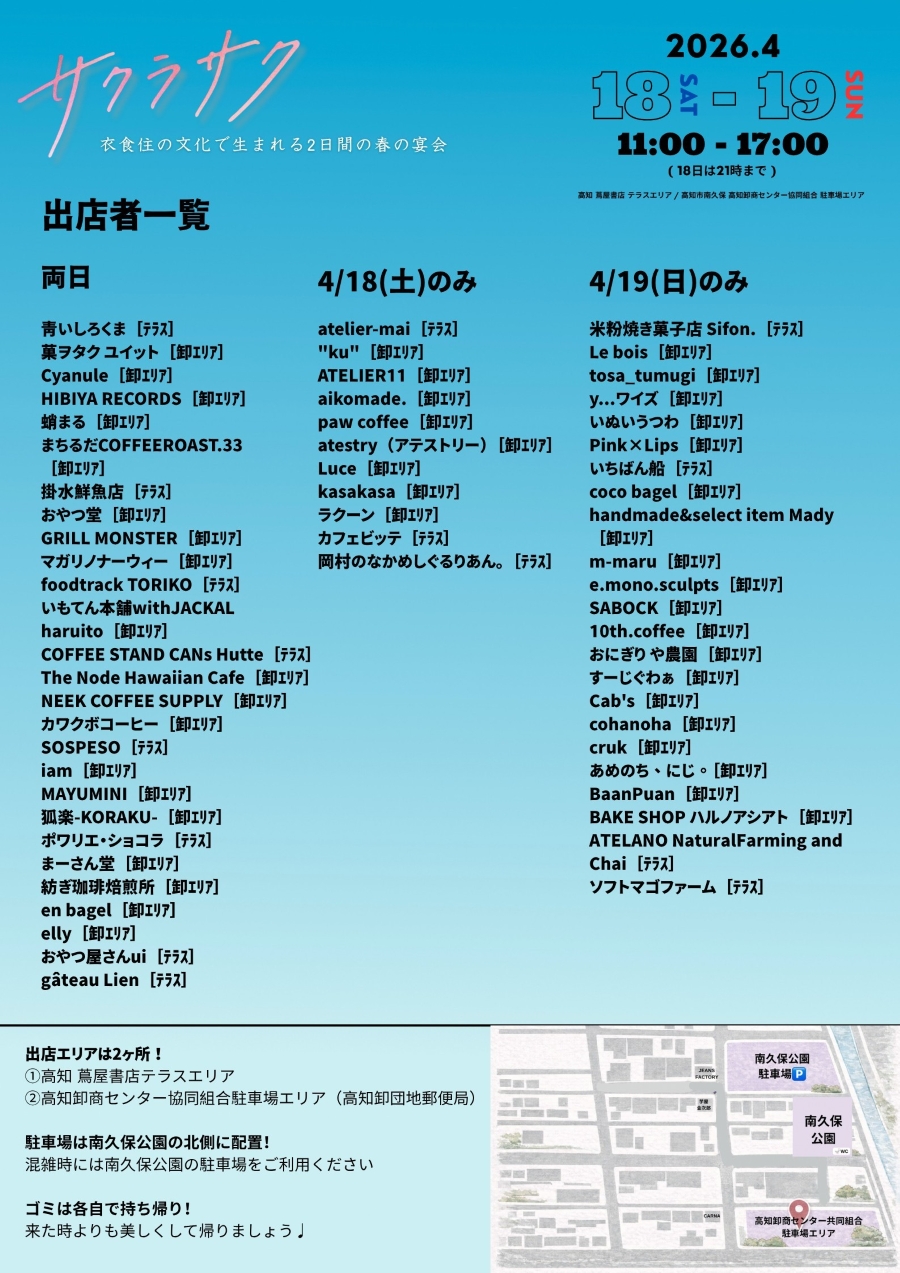高知市南御座の高知蔦屋書店テラスエリアと、高知市南久保の高知卸商センター協同組合の駐車場エリアで 2026 年 4 月 18 日(土)、19 日(日)、「サクラサク」が開かれます。