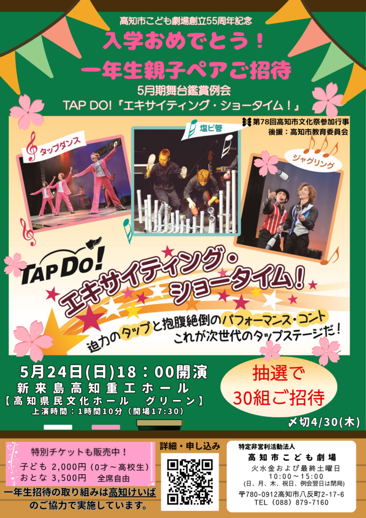 高知市で5/24に「エキサイティング・ショータイム」(高知県立県民文化ホール)|迫力のタップや抱腹絶倒のパフォーマンス・コント!新1年生の親子30組を招待!
