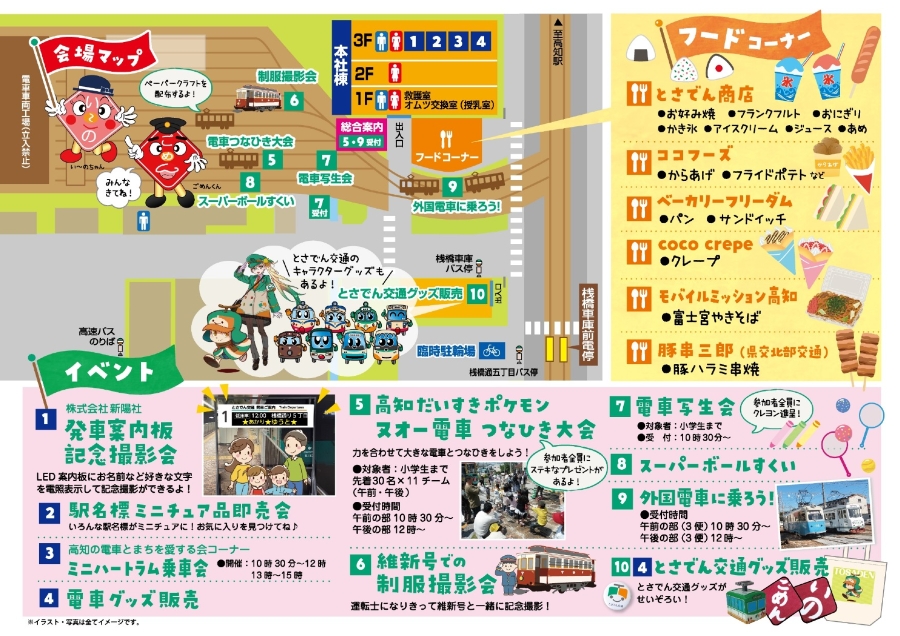 電車との綱引き大会、維新号での制服撮影会、発車案内板にLEDで好きな文字を表示して撮影できる記念撮影会、ミニハートラム乗車会、スーパーボールすくいなどが楽しめます。