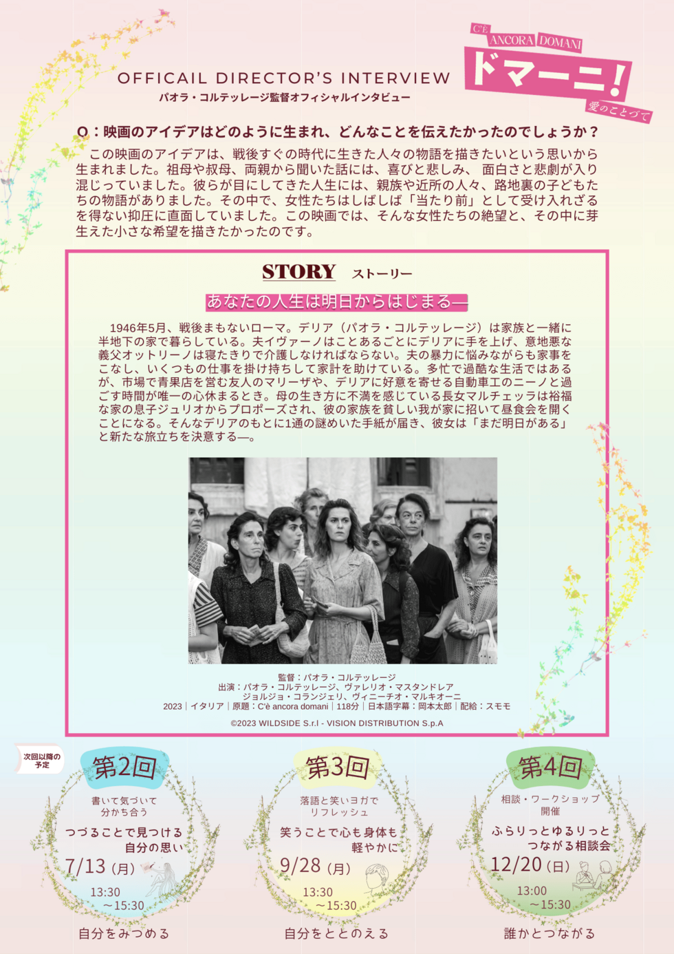 「ドマーニ!愛のことづて」は、2023 年にイタリア国内興行収入 1 位を記録した大ヒット作。 戦後まもないローマを舞台に、抑圧された生き方を自分たちで変えようとする女性たちが、軽やかに描かれています。